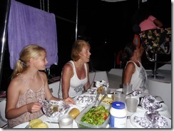 We mogen blijven eten. Er komt wel wat swell in deze ondiepe baai rollen en de eerste groene bleekneusjes vragen om pilletjes. Er wordt gegaapt en anderen voeren alvast de vissen . Eten wordt beleefd afgeslagen. Wij zijn natuurlijk goed in geslingerd en hebben nergens last van. We zijn eerst wat bang dat we de gasten het eten uit de mond stoten maar veel hebben geen trek of nauwelijks dus uiteindelijk hoeven we ons niet te generen. Heerlijk zalm, gepofte aardappels en zelfs asperges! En wat is het ontzettend gezellig om mijn oude schoolmakker weer te spreken en elkaar te vertellen over onze levens in twee ver uit elkaar liggende landen! Gelukkig kan ik me nuttig maken door te helpen met de afwas. Niet al te laat nemen we afscheid. We zijn flink moe van de lange dag en de bemanning van de Bluetooth ook!
